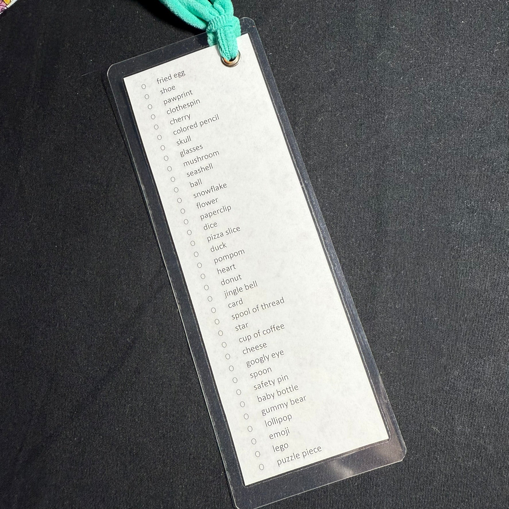 The real magic of the iSpy bag lies in the challenge it presents. Tucked within the treasure trove of objects are specific items for the seeker to find. These items may include anything from a tiny silver spoon to a miniature rubber ducky. The seeker's task is to search through the bag, visually exploring every nook and cranny until they locate all the hidden treasures. Attached is a bookmark including both pictures and a word list to see what items can be found. The bookmark is laminated to allow use of a dry erase marker to mark what has been found. Simply wipe off when done and play again!