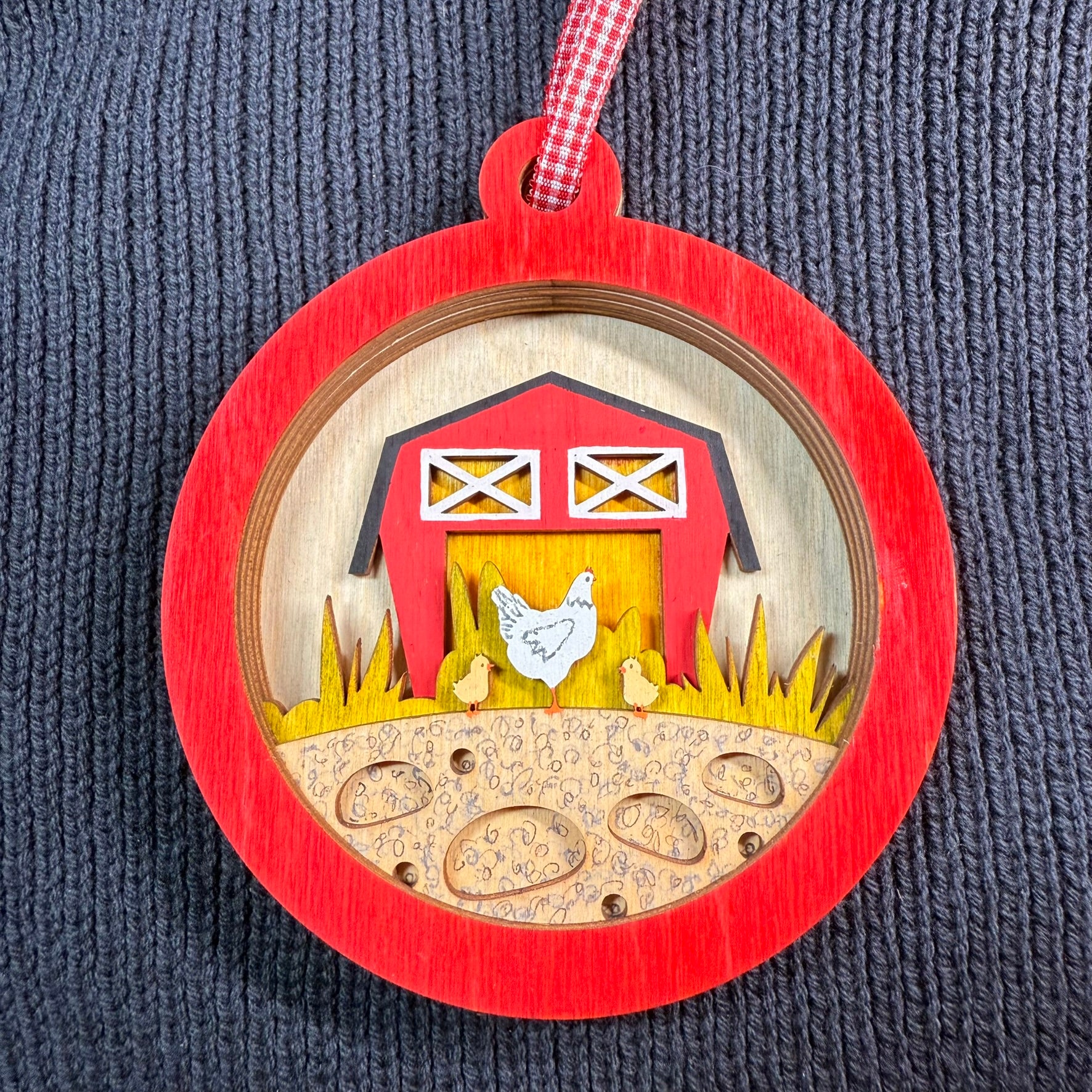 This layered wood ornament has been hand crafted, finished with a combination of alcohol inks, acrylic or oil based paints, glitter and wood stains. Each layer has been laser cut in intricate designs to create a multi dimensional scene, then meticulously hand painted to add a special touch to any holiday decor. Tied with coordinating ribbon, these ornaments are perfect for gift giving or a great addition to your own collection.