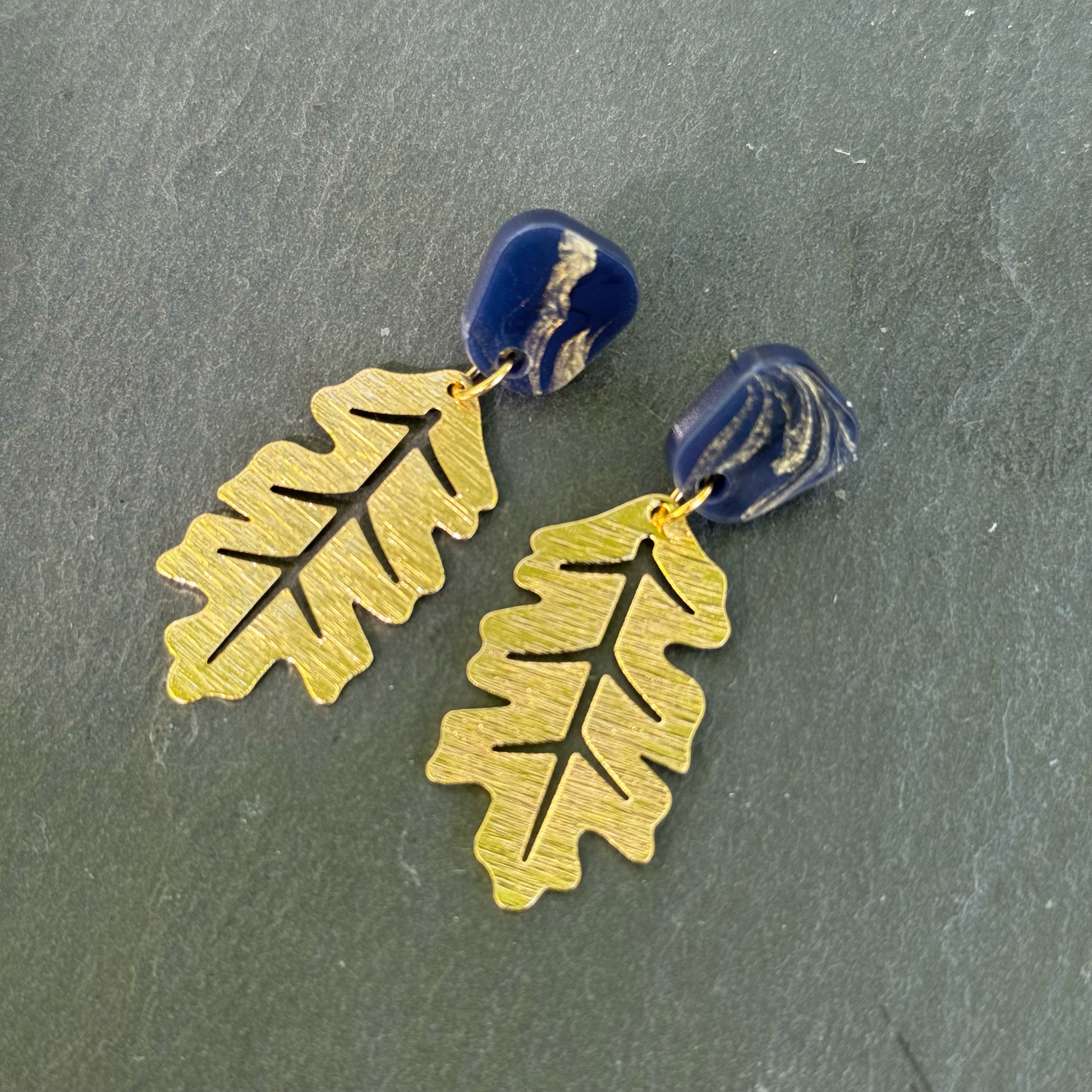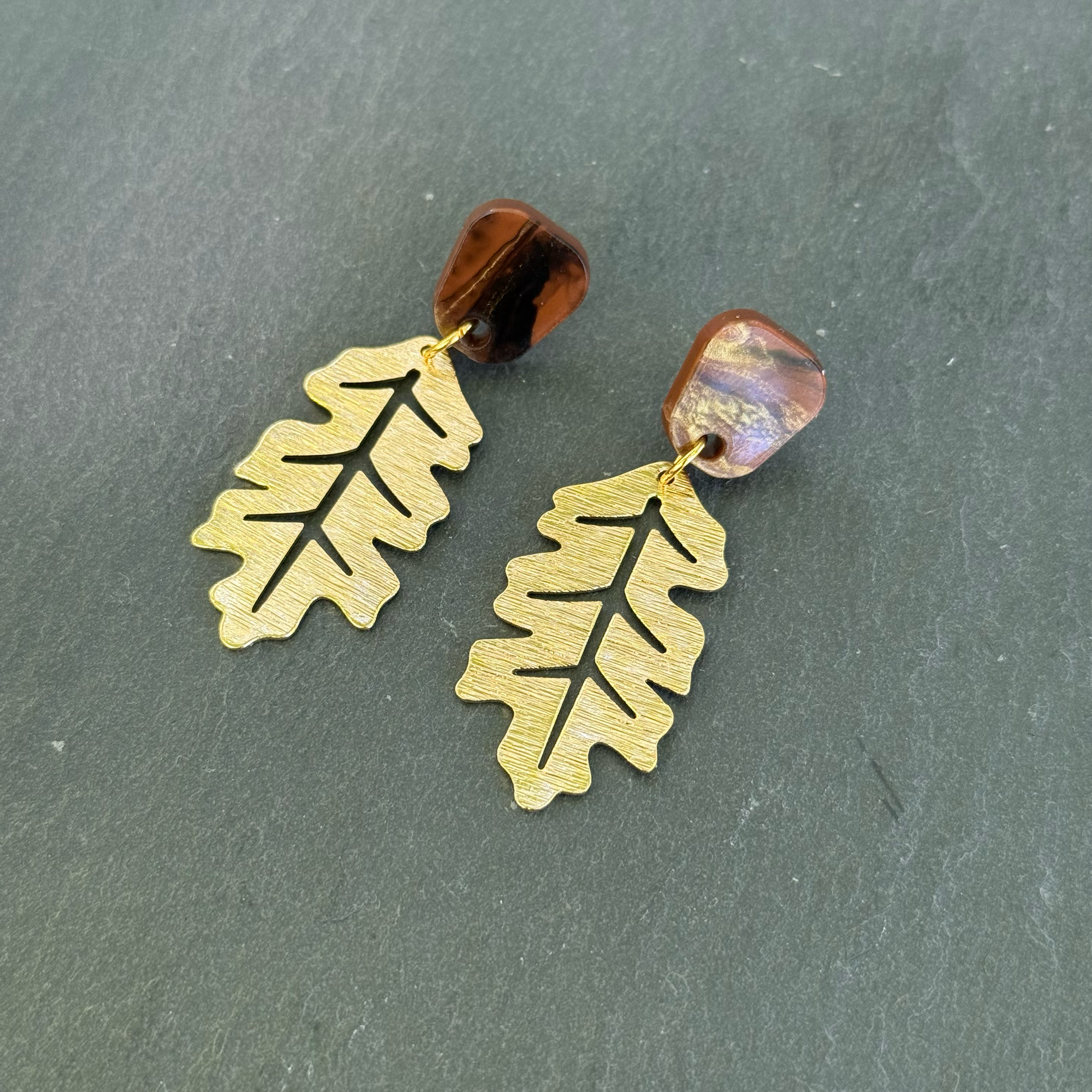 Gold Leaf with Swirl Acrylic Stud Dangle Earrings (