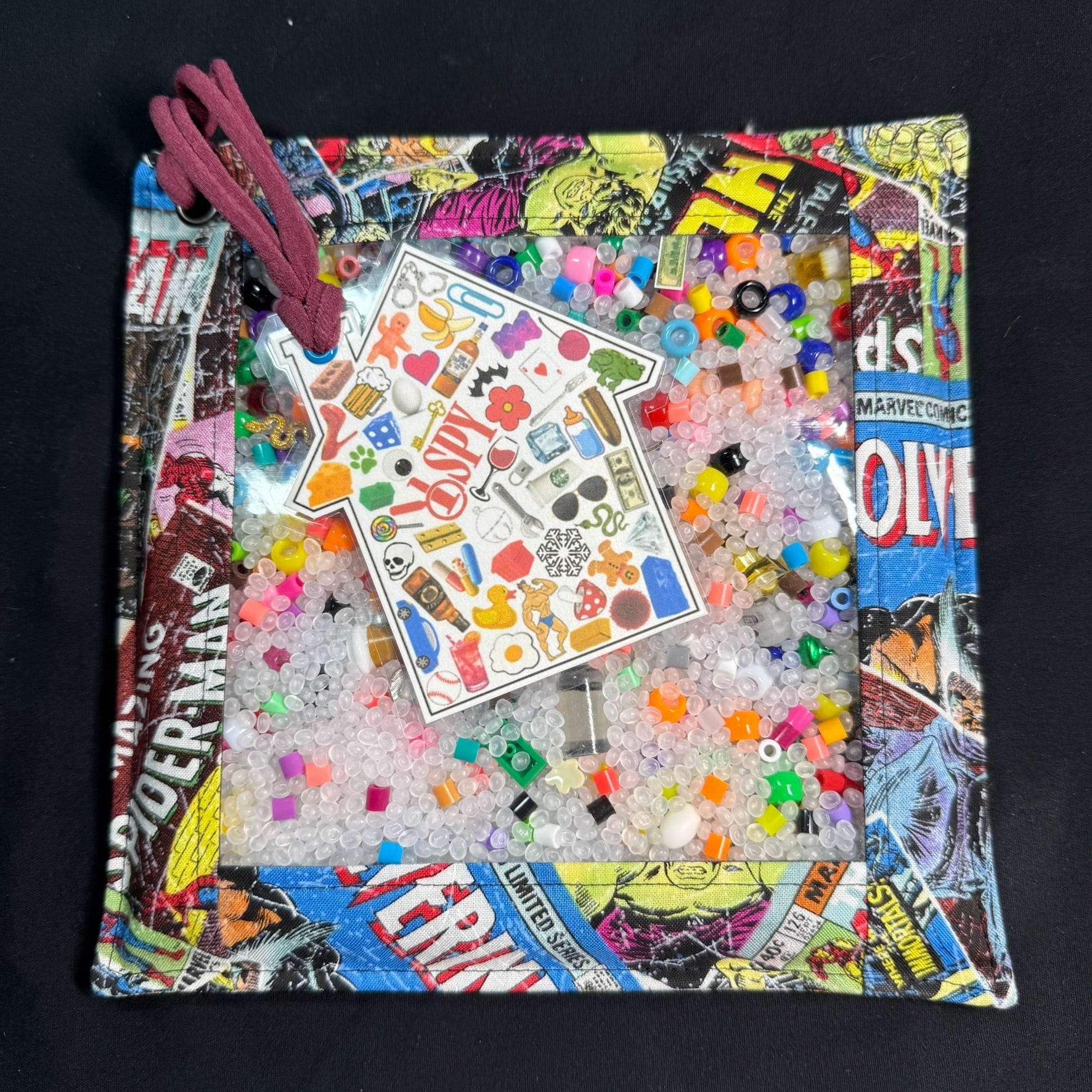 The real magic of the iSpy bag lies in the challenge it presents. Tucked within the treasure trove of objects are specific items for the seeker to find. These items may include anything from a tiny silver spoon to a miniature rubber ducky. The seeker's task is to search through the bag, visually exploring every nook and cranny until they locate all the hidden treasures. Attached is a house shaped bookmark including both pictures and a word list to see what items can be found. The bookmark is laminated to allow use of a dry erase marker to mark what has been found. Simply wipe off when done and play again!