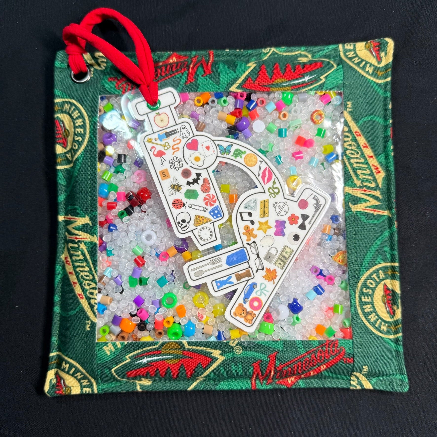 The real magic of the iSpy bag lies in the challenge it presents. Tucked within the treasure trove of objects are specific items for the seeker to find. These items may include anything from a tiny silver spoon to a miniature gummy bear. The seeker's task is to search through the bag, visually exploring every nook and cranny until they locate all the hidden treasures. Attached is a microscope shaped bookmark including both pictures and a word list to see what items can be found. The bookmark is laminated to allow use of a dry erase marker to mark what has been found. Simply wipe off when done and play again!