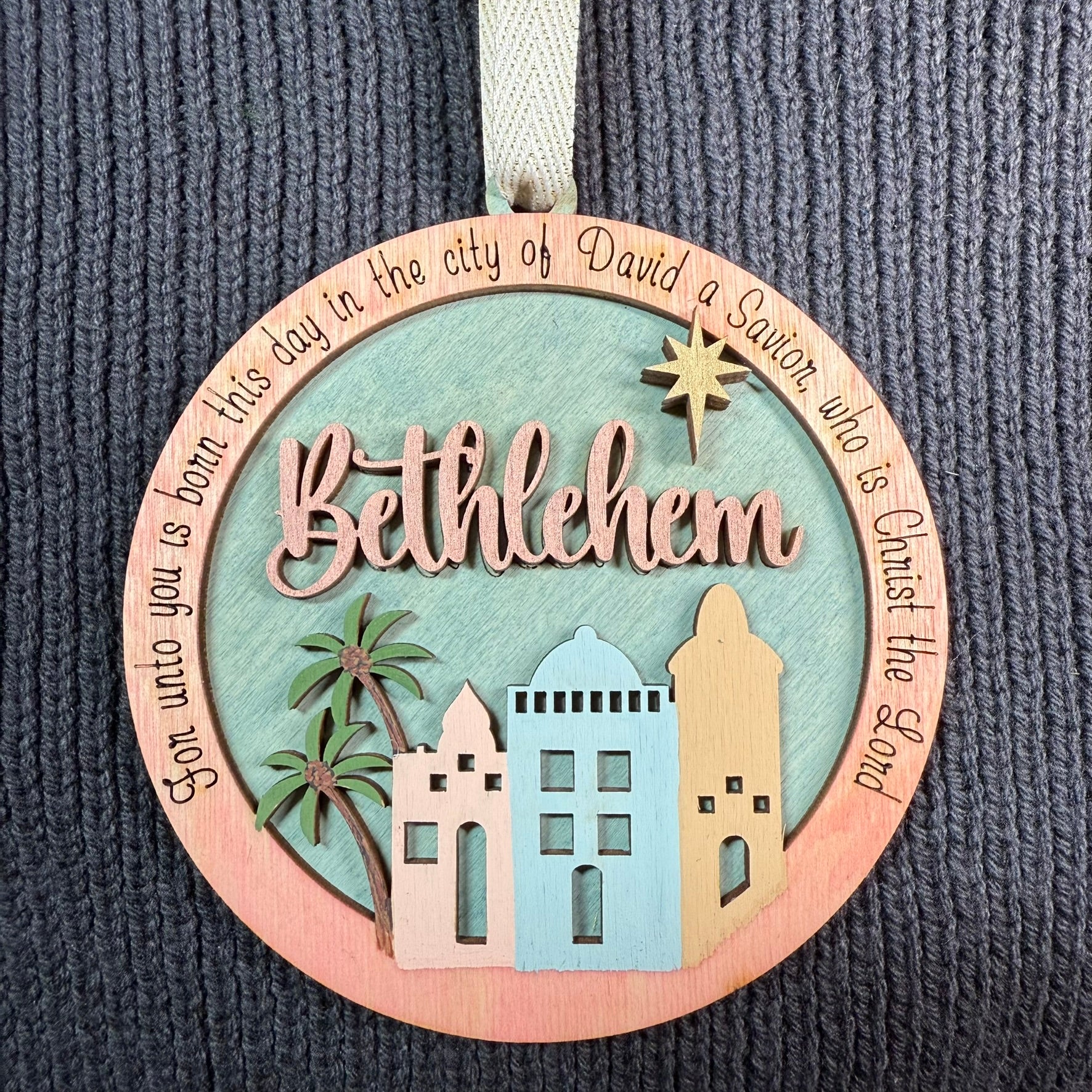 This layered wood ornament has been hand crafted, finished with a combination of alcohol inks, acrylic or oil based paints, glitter and wood stains. Each layer has been laser cut in intricate designs to create a multi dimensional scene, then meticulously hand painted to add a special touch to any holiday decor. Tied with coordinating ribbon, these ornaments are perfect for gift giving or a great addition to your own collection.