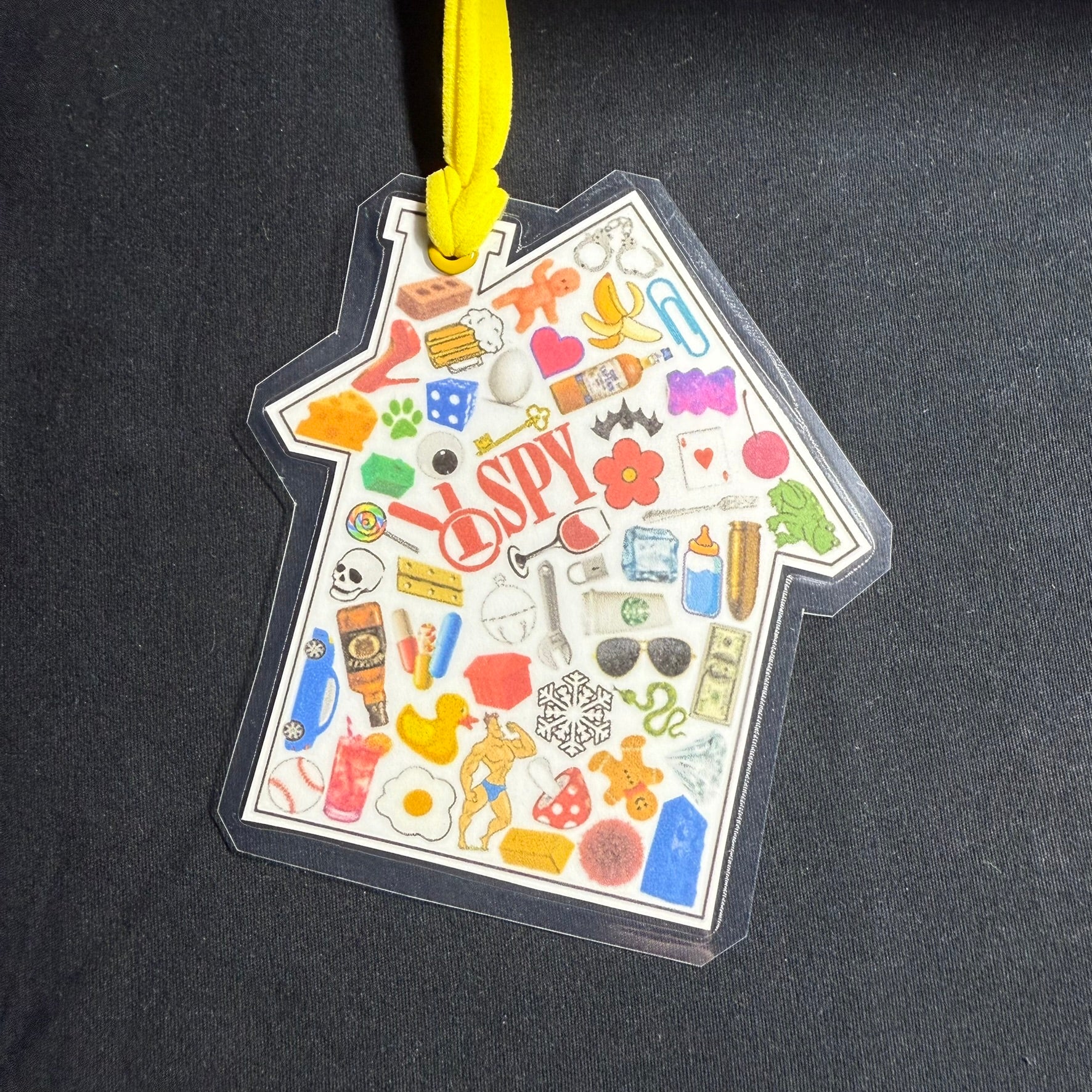 The real magic of the iSpy bag lies in the challenge it presents. Tucked within the treasure trove of objects are specific items for the seeker to find. These items may include anything from a tiny silver spoon to a miniature rubber ducky. The seeker's task is to search through the bag, visually exploring every nook and cranny until they locate all the hidden treasures. Attached is a house shaped bookmark including both pictures and a word list to see what items can be found. The bookmark is laminated to allow use of a dry erase marker to mark what has been found. Simply wipe off when done and play again!