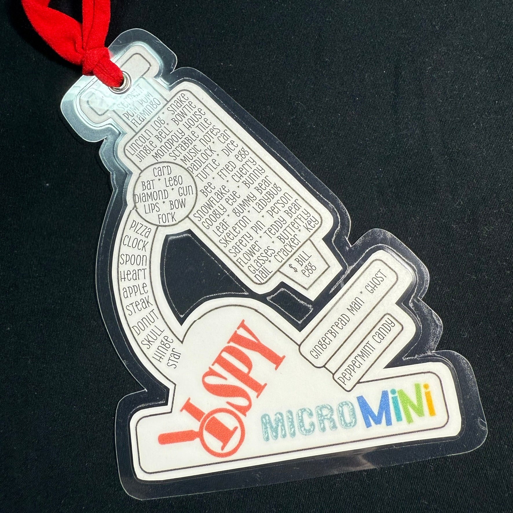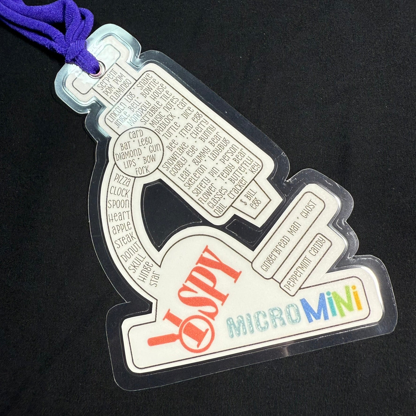 The real magic of the iSpy bag lies in the challenge it presents. Tucked within the treasure trove of objects are specific items for the seeker to find. These items may include anything from a tiny silver spoon to a miniature gummy bear. The seeker's task is to search through the bag, visually exploring every nook and cranny until they locate all the hidden treasures. Attached is a microscope shaped bookmark including both pictures and a word list to see what items can be found. The bookmark is laminated to allow use of a dry erase marker to mark what has been found. Simply wipe off when done and play again!